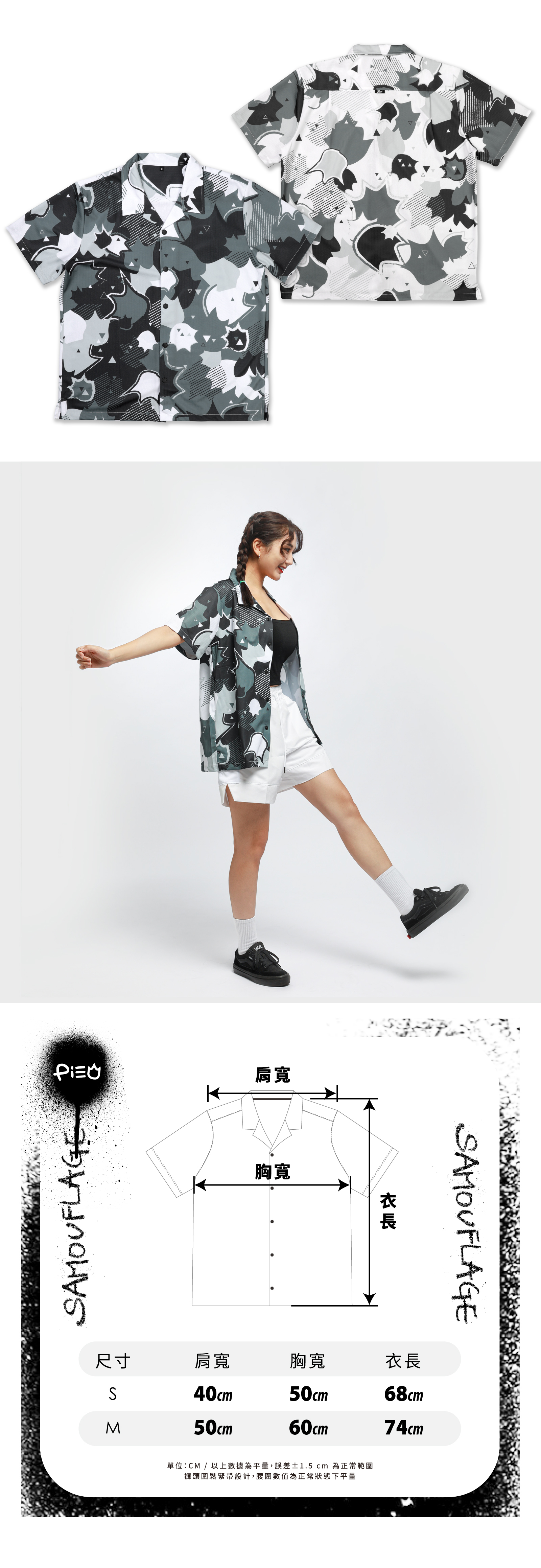 Piew Piew 團隊融合撞色迷彩以及塗鴉創作出這組「植物迷彩」,材質採用運動用機能布料,款式以經典的古巴領襯衫為藍圖,兼具時尚俐落感及休閒舒適度!