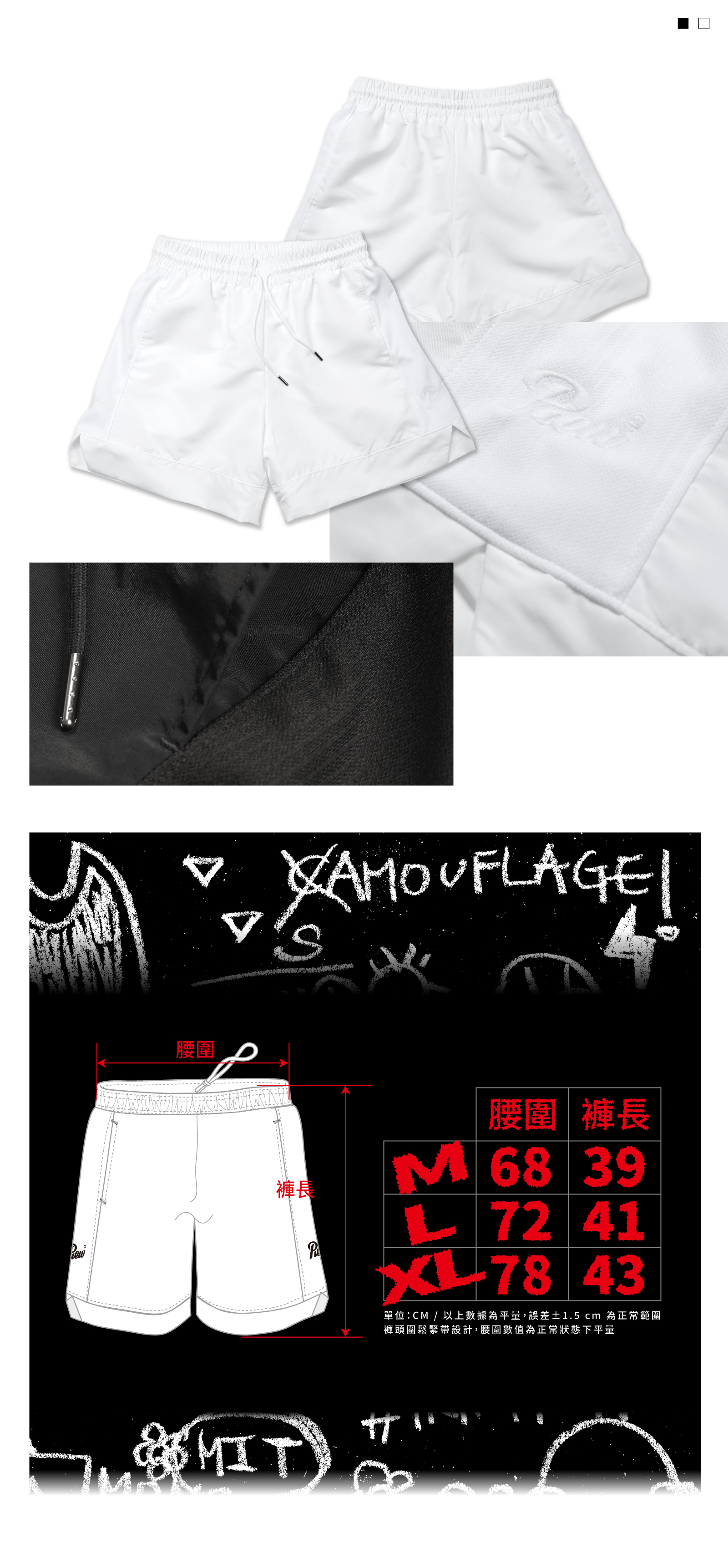 Piew Piew "SAMOUFLAGE" collection 新品,低調無印風格的短褲。兩側以透氣布料編織而成,內裡親膚材質舒適俐落。褲長設計為膝上褲,適合台灣炎熱天氣的涼感清爽著用感。Piew Piew 的品牌 logo 以刺繡方式,低調的縫製在左邊褲管,以同色系的方式隱藏在細節裡。